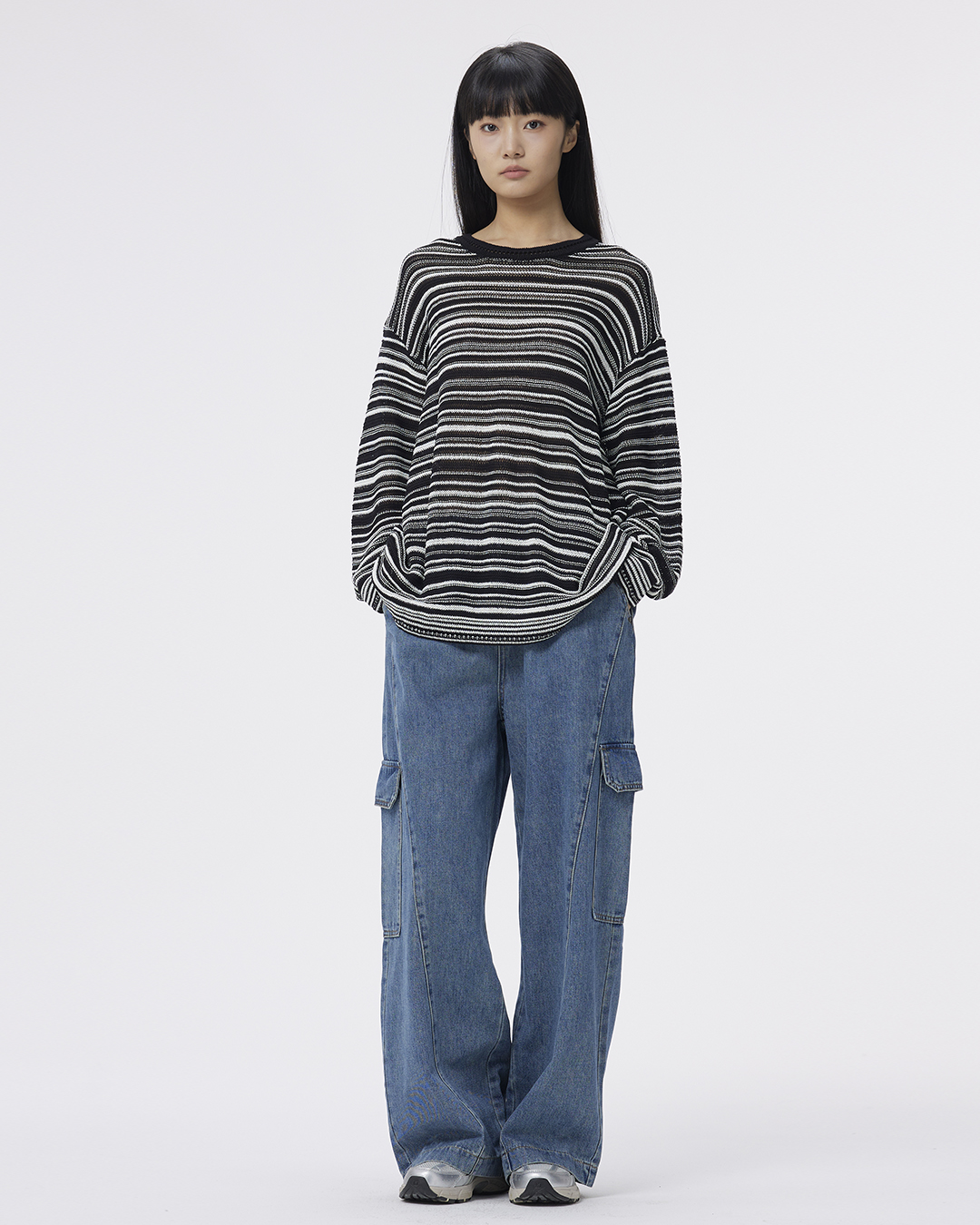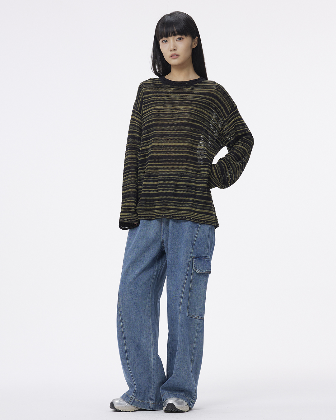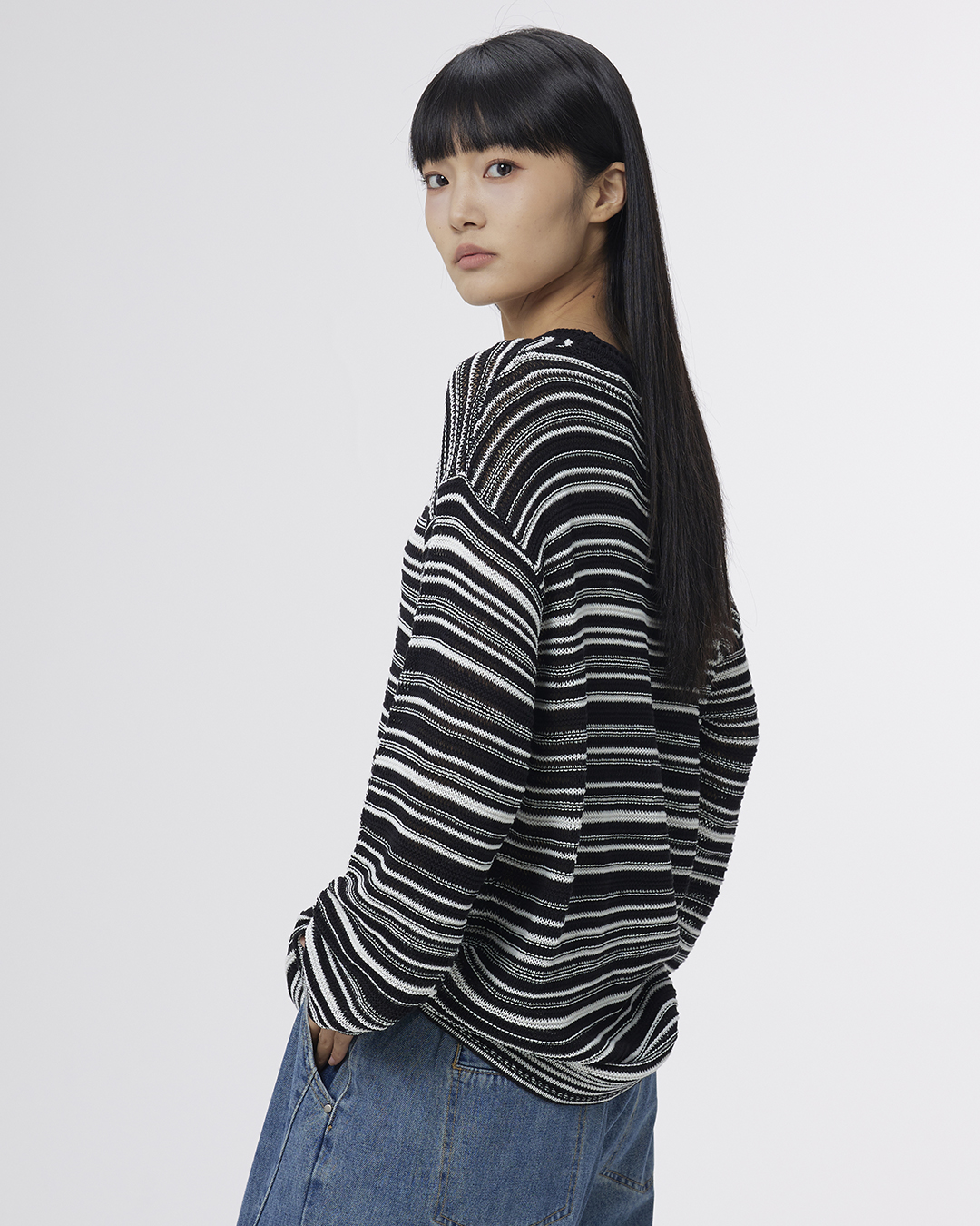 A Simple Round-neck, Color-blocking Striped Knitted Sweater